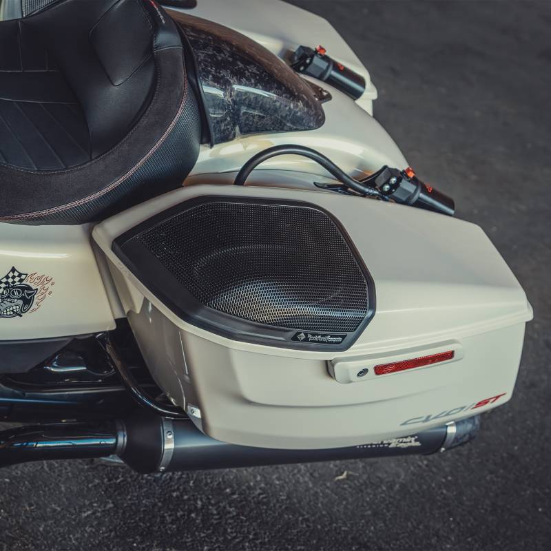 Element Ready™ speakers are built to endure harsh outdoor conditions, resisting dust, water, and UV exposure. Precision-tuned, long-throw drivers deliver high-output, deep, and balanced sound with extended low-end response. The curvilinear carbon-filled poly cone and integrated motor cover ensure durability, stiffness, and protection for your saddlebags.