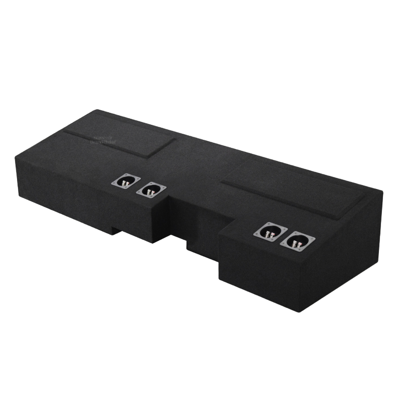 Constructed from 5/8" high-quality MDF, this enclosure delivers a rigid structure that minimizes vibration for clean, precise bass. Wrapped in durable trunk-liner carpet, it protects the enclosure while offering a sleek, factory-style appearance. An airtight Titebond silicone seal ensures accurate internal air pressure for tight low-frequency response, and high-strength Titebond wood glue provides long-lasting durability. Equipped with 4 spring-loaded terminals, it allows secure and reliable connections for multiple subwoofers. Designed for under-seat installation, its forward-firing design projects bass efficiently into the cabin for optimal sound coverage.