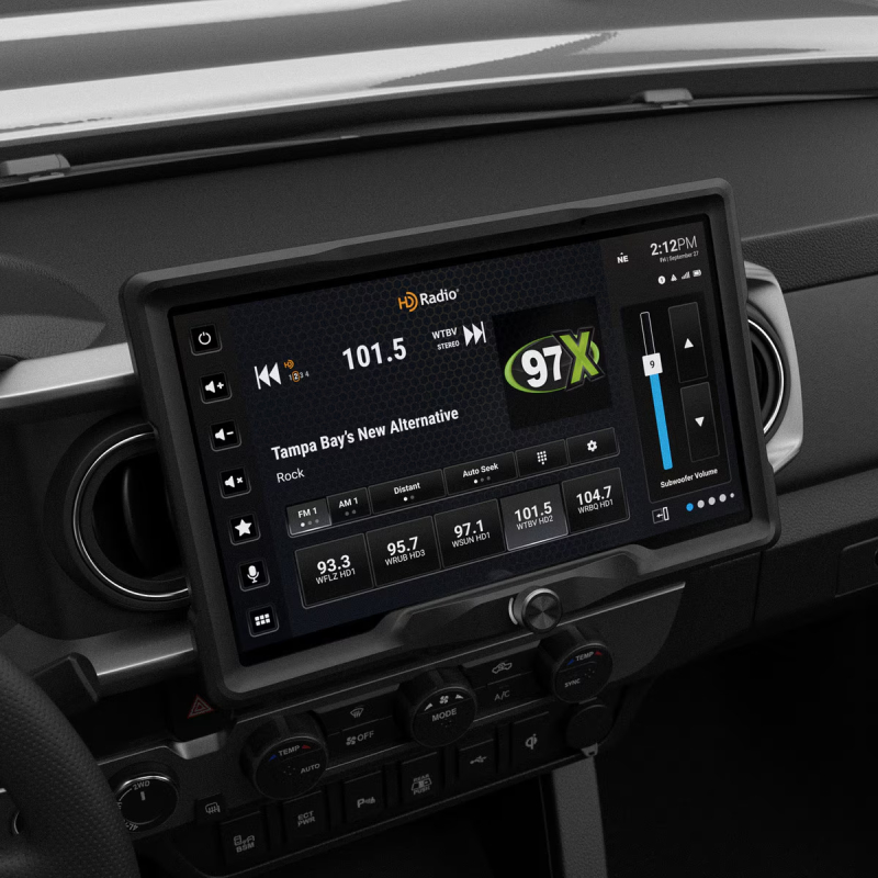 This system features a 12.8″ Full HD (1920×1080) touchscreen with anti-glare, anti-reflective, and anti-fingerprint coating for clear visibility in all conditions. The optically bonded, IP65-rated display enhances durability against dust and moisture (chassis not IP-rated) and supports wireless/wired Apple CarPlay and Android Auto, HD Radio, and SiriusXM readiness (optional tuner). It also includes accessory control for up to four external devices via screen (SwitchHub recommended).