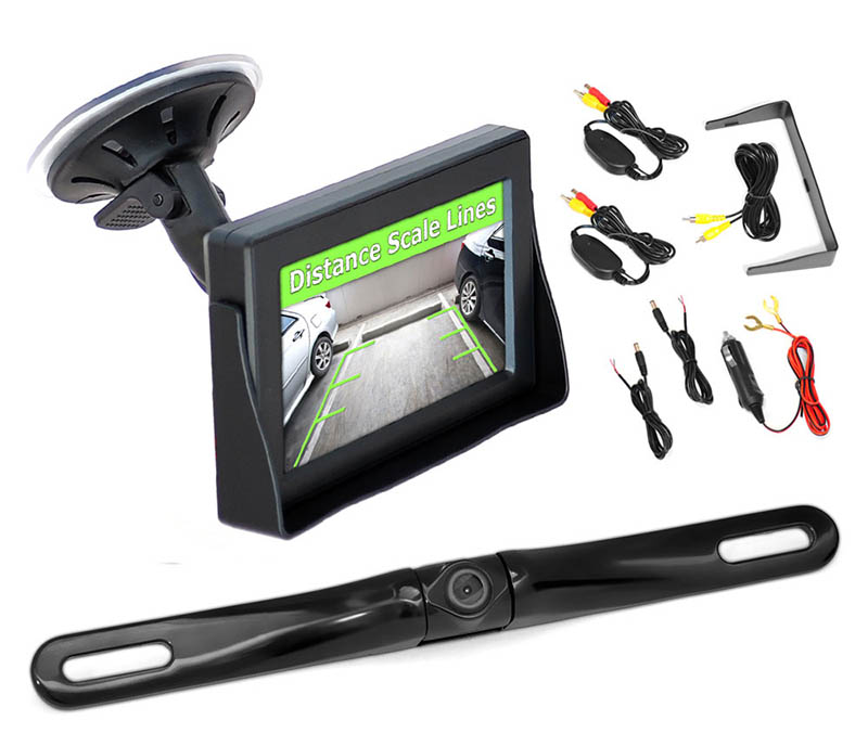 Wireless Transmission Back-Up Rearview Parking Assist System Kit with License Plate Camera, 4.3'' Monitor and Wireless Adapters