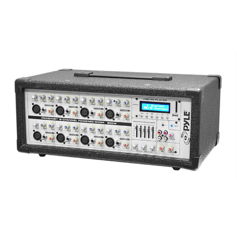 8-Channel 800 Watt Bluetooth Mixer with Balanced Mic & Line Inputs, USB & SD Card Readers