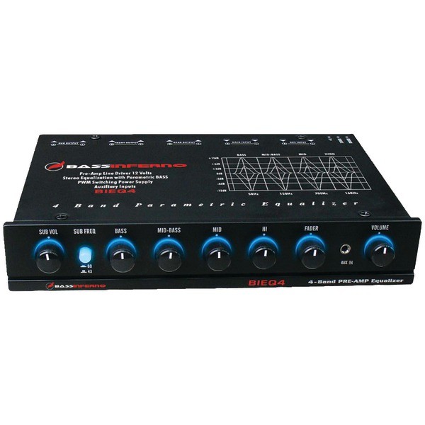 Db Bass Inferno BIEQ4 4-Band Car Audio Equalizer. Remote Bass Knobs parametric equalizer with 12 dB Boost/cut.