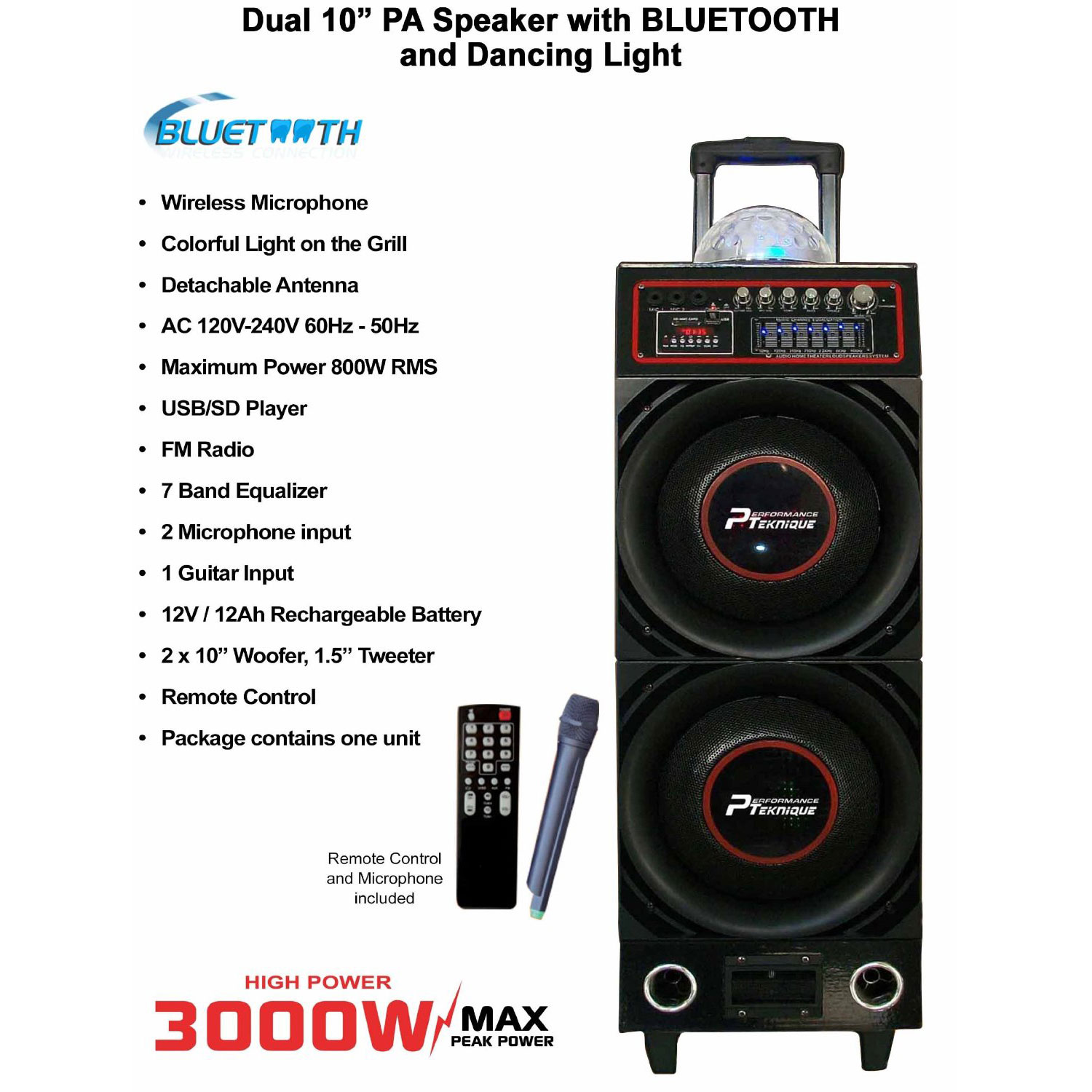 Dual 10” PA Speaker with Rechargeable Battery, BLUETOOTH, and Dancing Lights