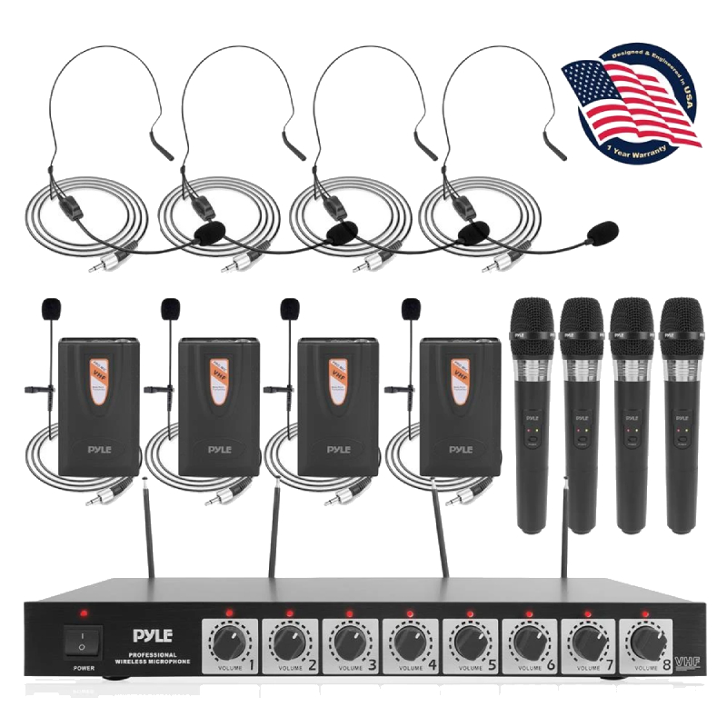8 Channel Wireless Microphone System - Rack Mountable with 4 Lavalier Mics, 4 Headsets, & 4 Handheld Mics
