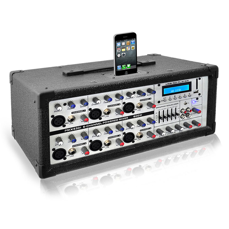 PMX Series 600W 6-Channel Professional Mixer with iPod Dock, MP3 Player Input, SD and USB Flash Readers