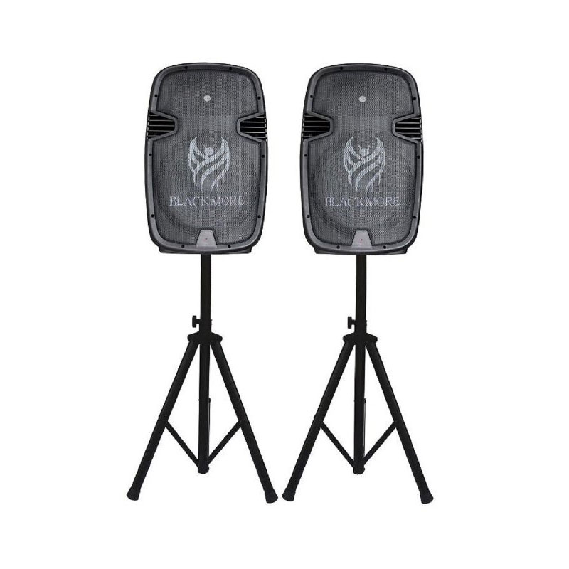 Professional PA system that includes 2 speaker cabinets . Wired microphone and collapsible tripod speaker stands. The System also acts as music player capable of playing audio files; USB,SD, and Bluetooth . Microphone inputs as well as RCA and XLR audio inputs with separate volume control for each input. a 15” woofer and titanium domed tweeter behind a molded horn. 3000 Watts