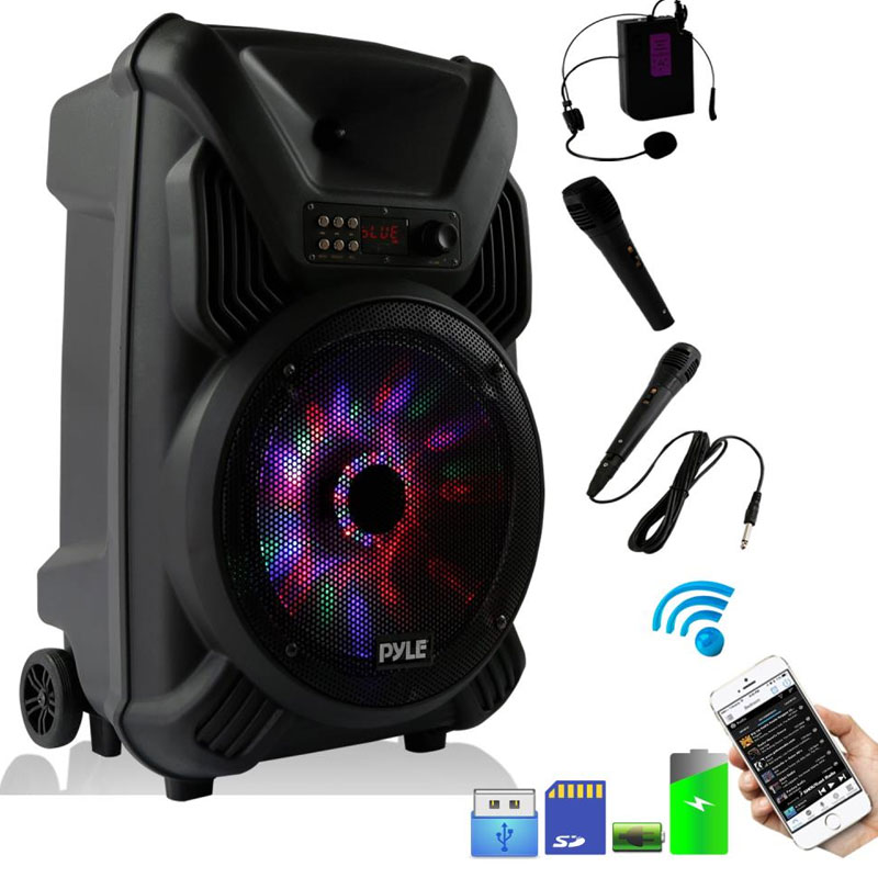 Portable PA Speaker & Microphone System, Bluetooth Wireless Streaming, Built-in Rechargeable Battery, Dancing LED Party Lights (Includes Wired & Headset Mics)