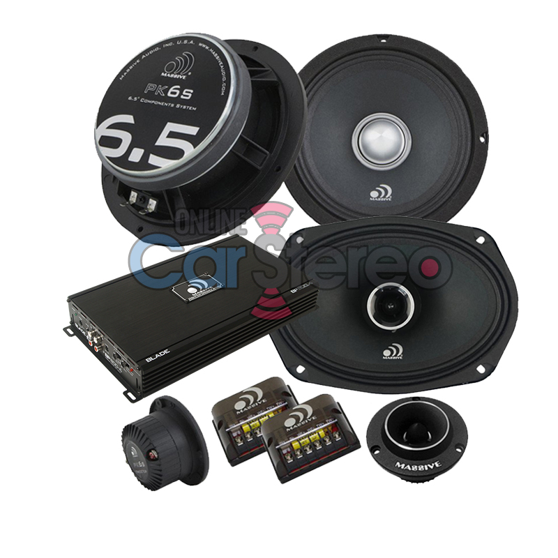 Massive BP800.4 800 Watts Max BLADE BP Series Class-A/B 4-Channel 2-ohm Stable Amplifier + PK6S 6.5" Shallow 2-Way 500 Watts Power with 25 mm Aluminum Tweeter Component Car Speakers + P69X PX Series 6"x9", 280 Watts Max Power, 4-Ohm Coaxial Car Speaker BUNDLE