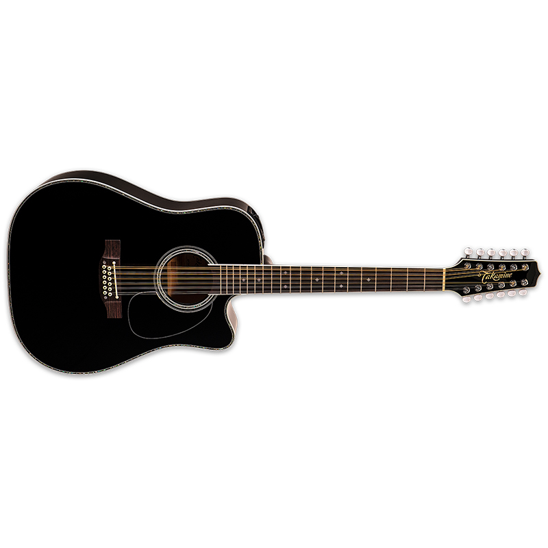 Takamine Guitars Deluxe Series 12-string Dreadnought With Cutaway, Solid Spruce Top, Abalone Purfling, Maple Back And Sides, Gloss Black Finish, Pearloid Tuning Machines, Ct4b-ii Electronics W/case