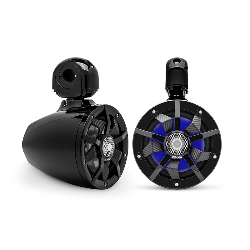 6.5" 80W RMS (100W Peak Power Handling) Enclosed Marine Tower Speakers, Black Enclosures with Black/Carbon Fiber “Spoke” Grilles, with built-in RGB LED lighting