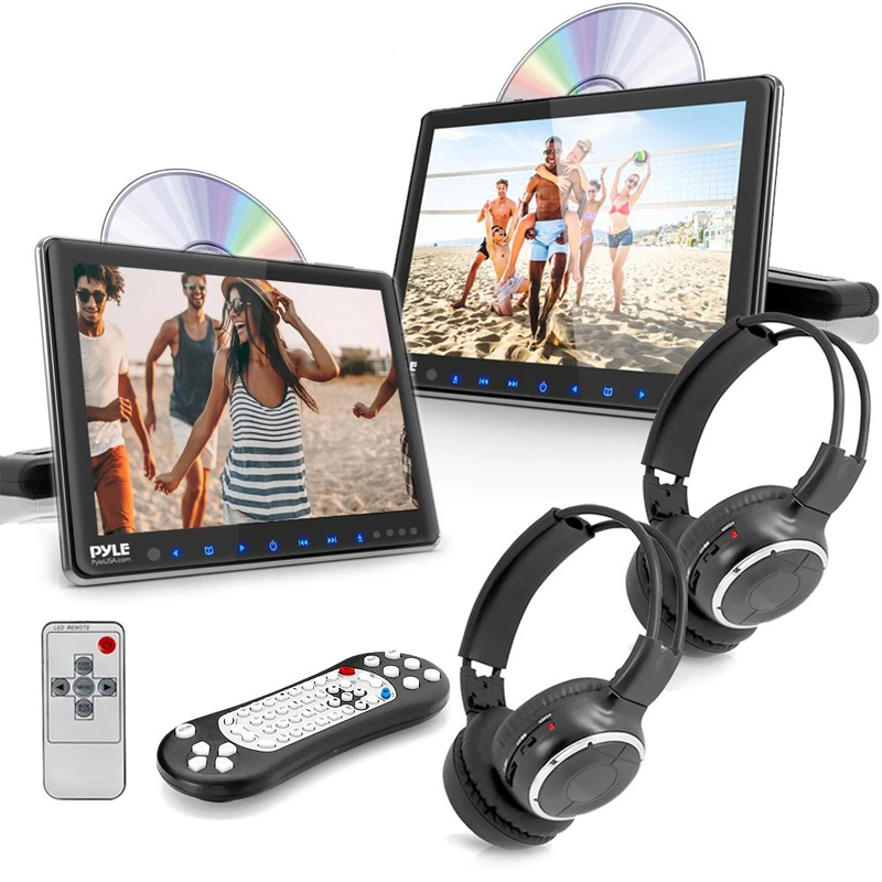 Dual Vehicle Headrest Mount CD/DVD Player System - Car Video Entertainment Display Monitors with Wireless Headphones (9.4’’ -inch)