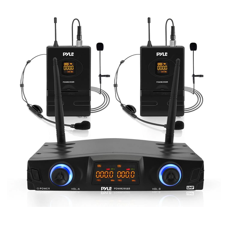 Compact UHF Pro Wireless Microphone System - USB Powered Desktop Mic Receiver System with Adjustable Volume Control, Includes (2) Belt-Pack Transmitters, (2) Headsets & (2) Lavalier Mics (2-Channel)