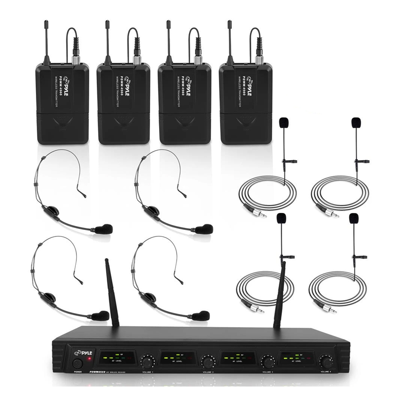 Wireless Microphone System, UHF Quad Channel Fixed Frequency, Rack Mount, Includes (4) Belt-Pack Transmitters, (4) Headset Mics & (4) Lavalier Mics