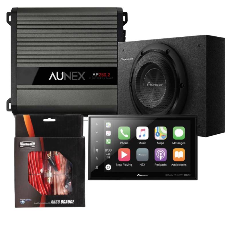 Pioneer DMH-C5500NEX 2-DIN 8" Digital Media Receiver + Pioneer TS-A2000LB A-Series 8" 250W RMS Subwoofer + Aunex AP250.2 AP Series 70W x 2 RMS @2Ohms Amplifier + SoundStorm AKS8 8 Gauge Amplifier Installation Kit