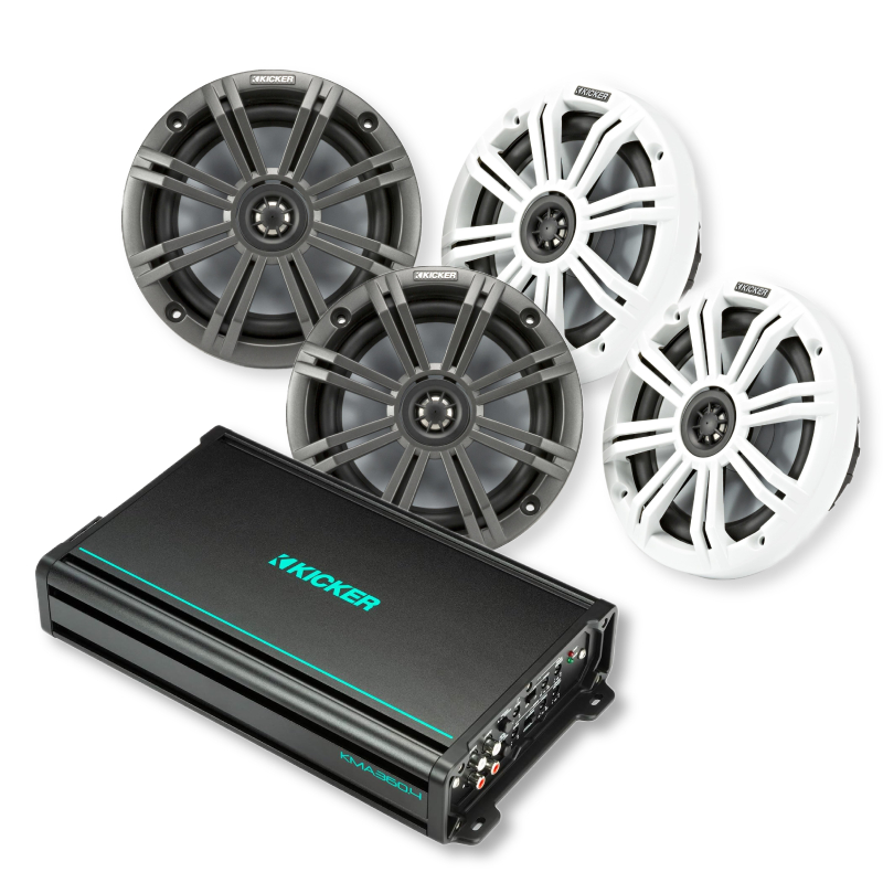 Two Pair KM Series 6.5" 195W Peak Power Handling 4 Ohm, 2-Way Marine Coaxial Speakers + KMA Series 500W Max Power 4-Channel, Class-D Weather-Resistant Marine Amplifier