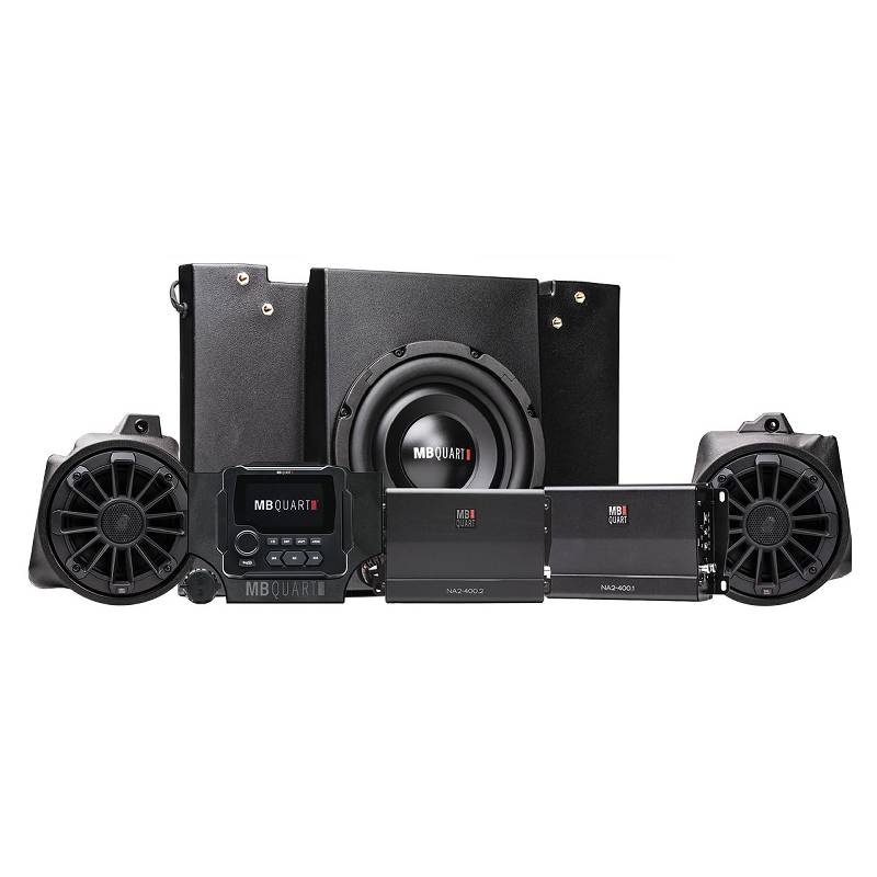 Honda Talon STAGE 3 800W 3-Speaker Audio System includes AM/FM, BT LED Source Unit controlling two amplifiers powering 2 coaxial speakers, 8" subwoofer in a sealed enclosure