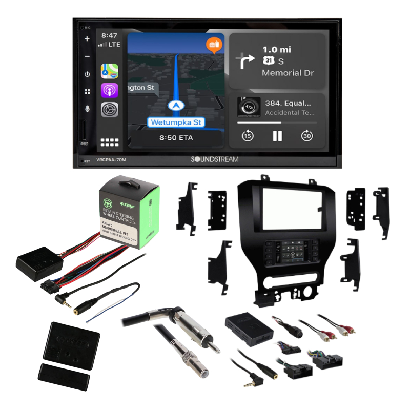 Soundstream VRCPAA-70M 7" 2-DIN Mechless Digital Multimedia Touchscreen Receiver + Metra Electronics 99-5838CH Single/Double DIN Dash Kit for Select 2015-Up Ford Mustang Vehicles + Metra Electronics 40-CR10 Factory Antenna to Aftermarket Radio Adapter for Chrysler/Dodge/Ford/GM 2006/Jeep 2002-Up + Axxess AXSWC Universal Steering Wheel Control Interface for 2015-Present Ford Mustang with 4" Oem Screen