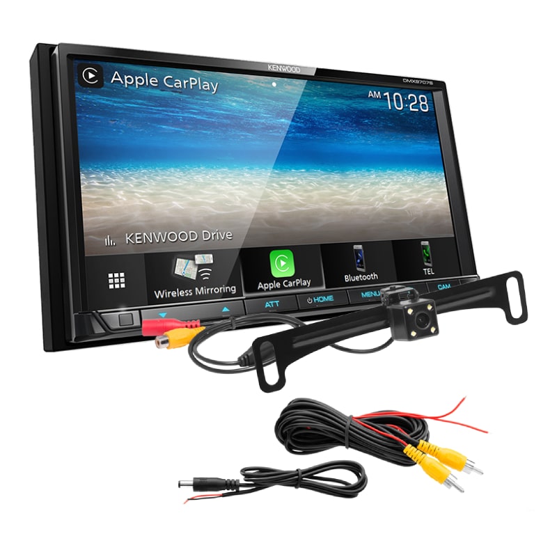 DMX9707S 6.95" WVGA Digital Multimedia Receiver with Dual-Rear USB, Wireless Apple CarPlay, Wireless Android Auto + ELPC40B Rear-View License Plate Mount Camera with Weather Proof, High-Resolution Color, and Wide-Angle View