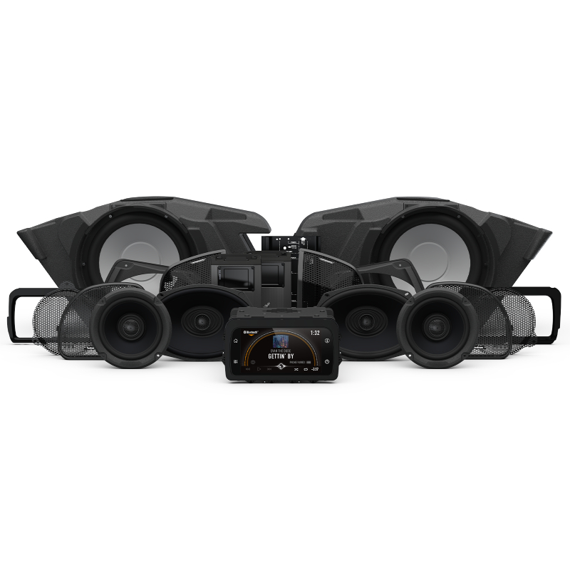 Stage 5 audio kit for 2014-up Harley-Davidson Motorcycles® includes Two 6.5" Speakers, Two 6"x9" 2-way Speakers, Digital Media Receiver, Two 10" Subwoofers and 4-Channel Amplifier