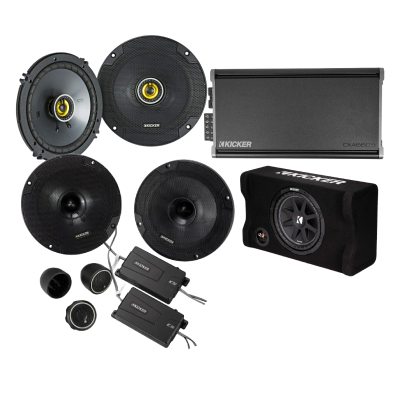 46CSC654 CS Series 6.5" 300W Peak Power Handling 4 Ohms 2-way Shallow Mount Coaxial Car Speakers (pair) + 46CSS654 CS Series 6.5" 300W Peak Power Handling 4 Ohms Component Speaker System + 46CXA6605t CX Series 90W x 4 + 300W x 1 @2Ohms, 660W Max Power Class A/B 5-Channel Full Range Amplifier + 48CDF104 Comp Series 10" 300W Peak Power Handling 4 Ohms Down Firing Enclosed Subwoofer