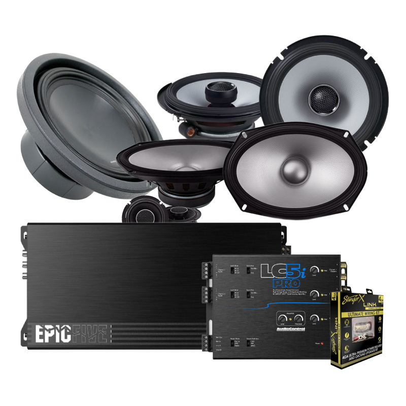 S2-S69C Component Speaker System + S2-S65 Coaxial Car Speakers (Pair) + SWT-10S2 Subwoofer Enclosure + EPICFIVE 5-Channel Class-D Car Amplifier with Remote Level Control Included + X2K41 4GA Power Wiring Kit + LC5i PRO 5-Channel Line-Output Converter High Voltage Design with Impedance Matching AccuBASS, GTO Signal Sensing, and Signal Bus