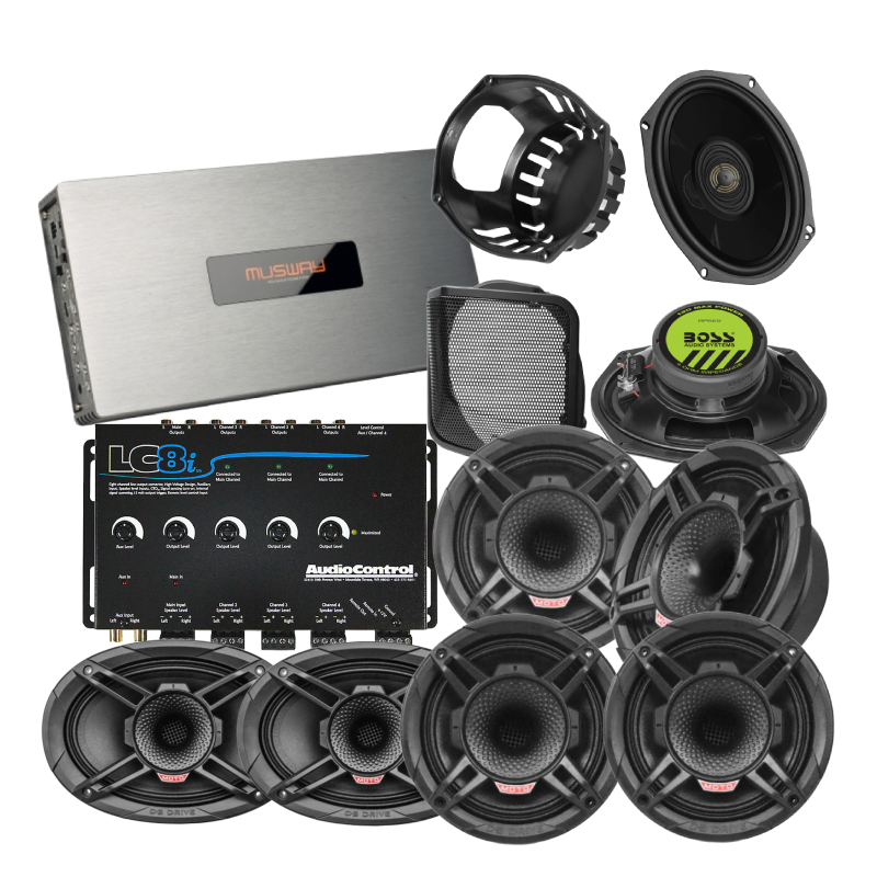 Two WDX6MOTO-CD WDX Series 6.5" 500W Peak Power Handling 4 Ohm, 2-Way Motorcycle Speakers with Rear Mounted Compression Driver (Pair) + WDX69MOTO-CD WDX Series 6x9" 650W Peak Power Handling 4 Ohm, 2-Way Motorcycle Speakers with Back Mounted Compression Driver (pair) + LC8I 8-Channel Line Output Converter with Auxiliary Input + SIX.100 6-Channel 196W RMS x 6 at 2 Ohm, Class-D Full Range Car Amplifier with Bass Remote Controller - German Engineered + BHD14 Harley Davidson 6"x9" Saddlebag Speaker Kit - 300W Peak Power Handling 4 Ohms, 2-Way Coaxial Speakers Fits Select 2014 and Up Road Glide and Street Glide Motorcycles (pair)