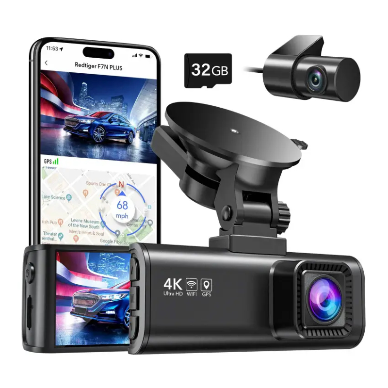 Full HD 2 Camera System 4K Front and 1080P Rear Dash Cam with Built-In WiFi, GPS Navigation, Night Vision, and 24H Parking Mode (32GB SD Card Included)
