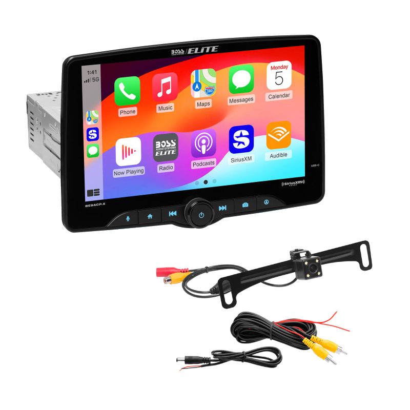 BE9ACP.X 9" Digital Multimedia Receiver with Wired Apple CarPlay® & Android Auto™, Bluetooth® and SiriusXM-Ready® with Built-In DSP 13-Band EQ (Double-DIN Adapter Brackets Included) + ELPC40B Rear-View License Plate Mount Camera with Weatherproof, High-Resolution Color, and Wide-Angle View