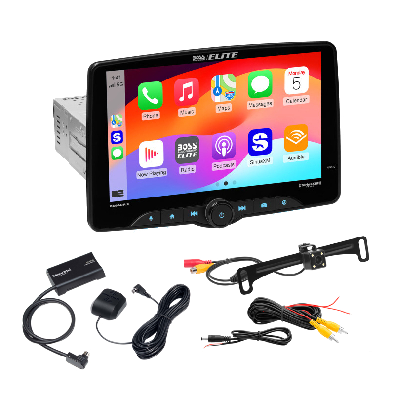 BE9ACP.X 9" Digital Multimedia Receiver with Wired Apple CarPlay® & Android Auto™, Bluetooth® and SiriusXM-Ready® with Built-In DSP 13-Band EQ (Double-DIN Adapter Brackets Included) + ELPC40B Rear-View License Plate Mount Camera with Weatherproof, High-Resolution Color, and Wide-Angle View + SXV300V1 Satellite Radio Tuner