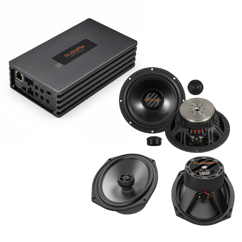 MINI4S 4-Channel 760W RMS, Class-D Mini Car Amplifier with Integrated Bluetooth with Remote Level Controller Included - German Engineered + MG6.2A MG Series 6.5" 125W RMS 4 Ohms, Active 2-Way Car Component System + MC692 MC Series 6"x9" 120W RMS 4 Ohm, 2-Way Coaxial Car Speakers (pair)